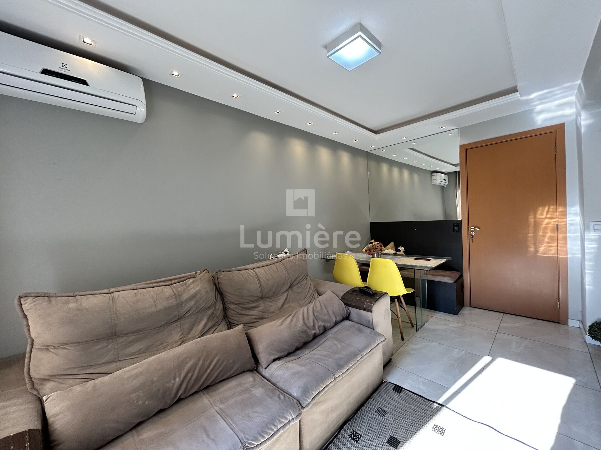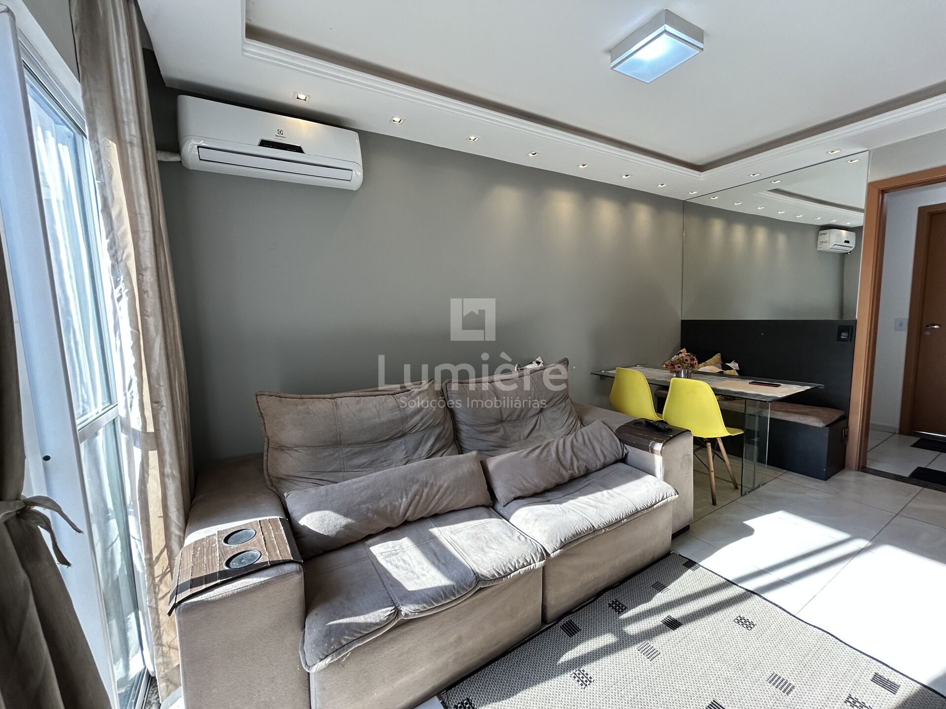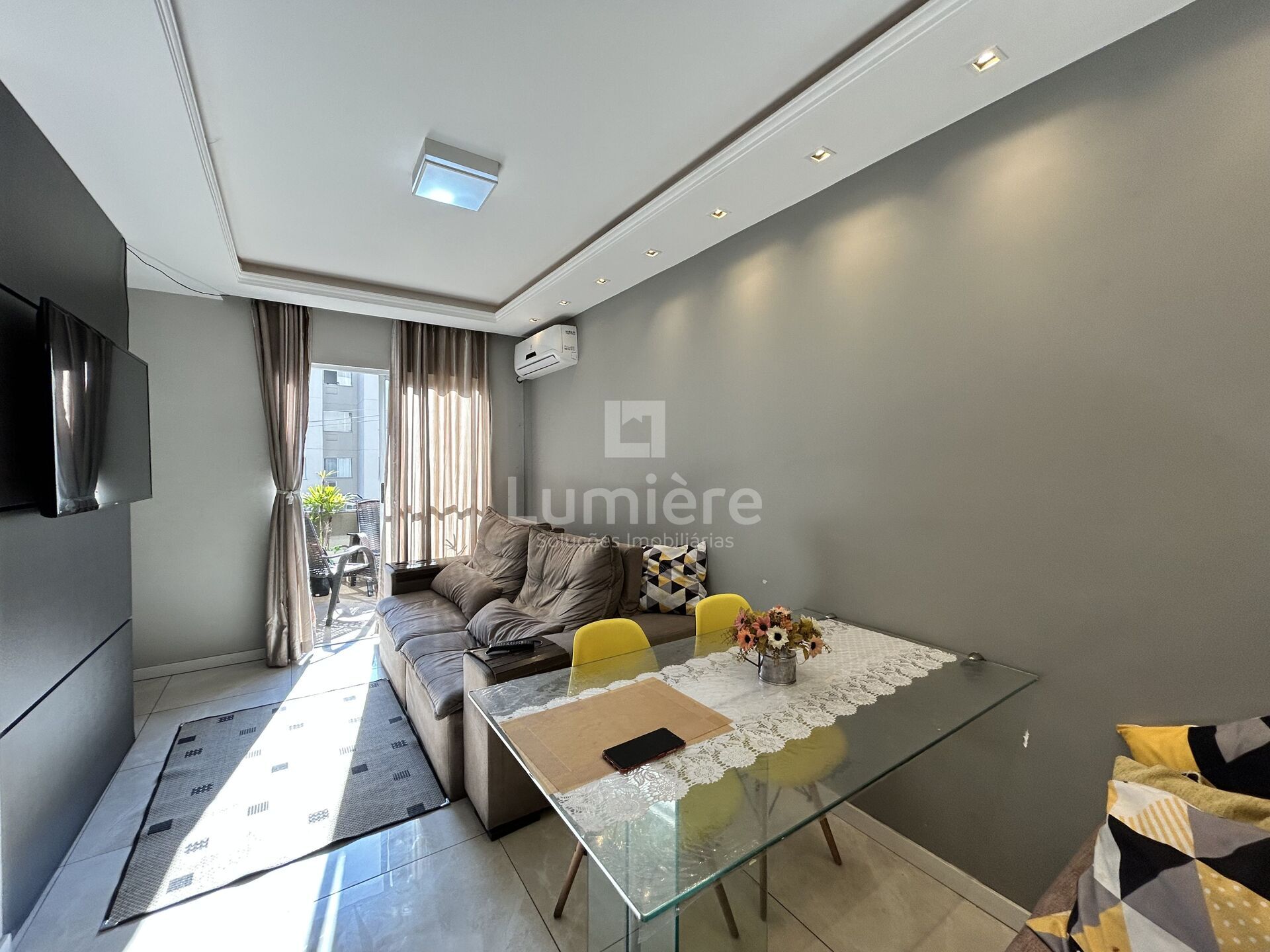 - 1 sala com móveis planejados (mesa de vidro, banco alemão com baú, painel de TV e espelho grande)