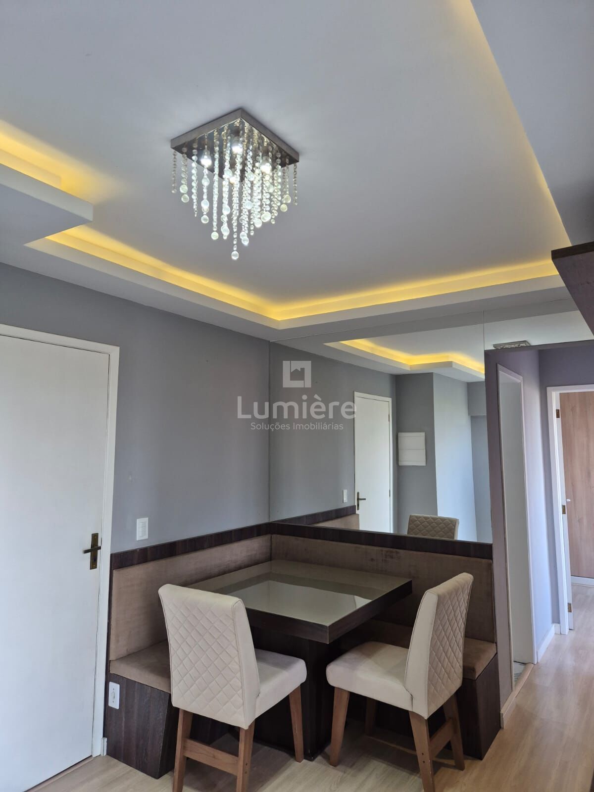- Sala com ar-condicionado, rebaixamento em gesso, sanca, iluminação em LED, painel de TV, espelho, lustre e mesa com cadeiras